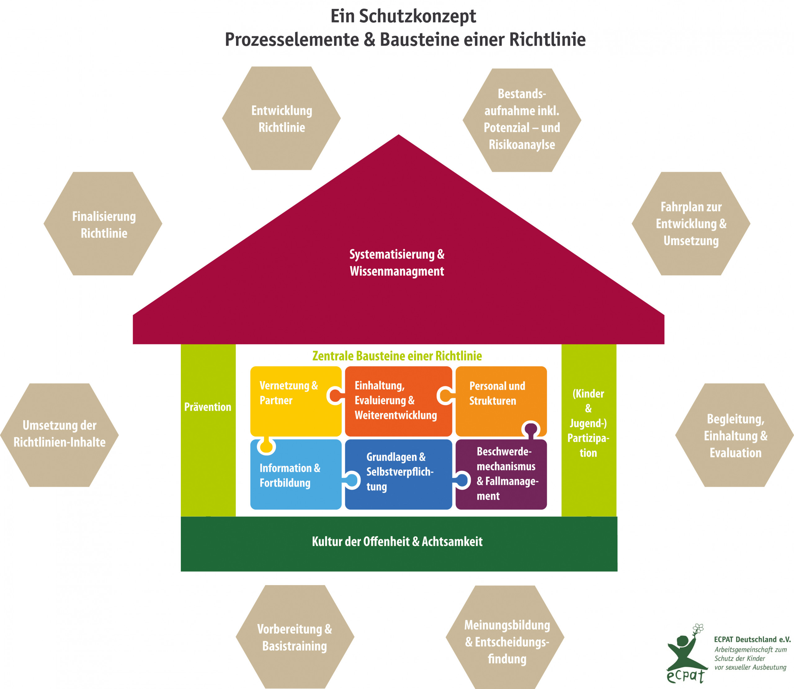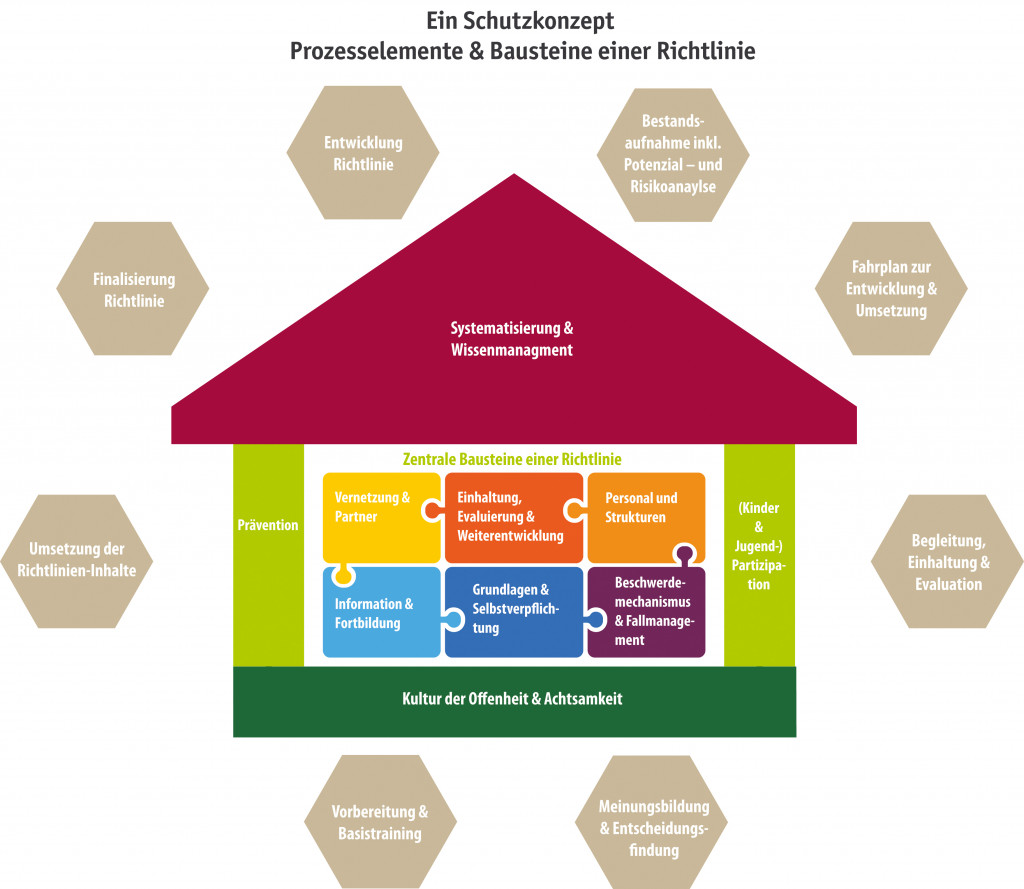 Ein Institutionelles Kinderschutz-System ist eine Verbindung der Maßnahmen einzelner Organisationen mit den staatlichen, gemeinschaftlichen und familiären Schutzsystemen. Denn Gewalt gegen Kinder und Jugendliche ist zweifelsohne fester Bestandteil der Gesellschaft. Nicht ein*e Akteur*in alleine kann dagegen etwas ausrichten, es braucht die Zusammenarbeit, Vernetzung und gemeinsamen Anstrengungen aller Bereiche.